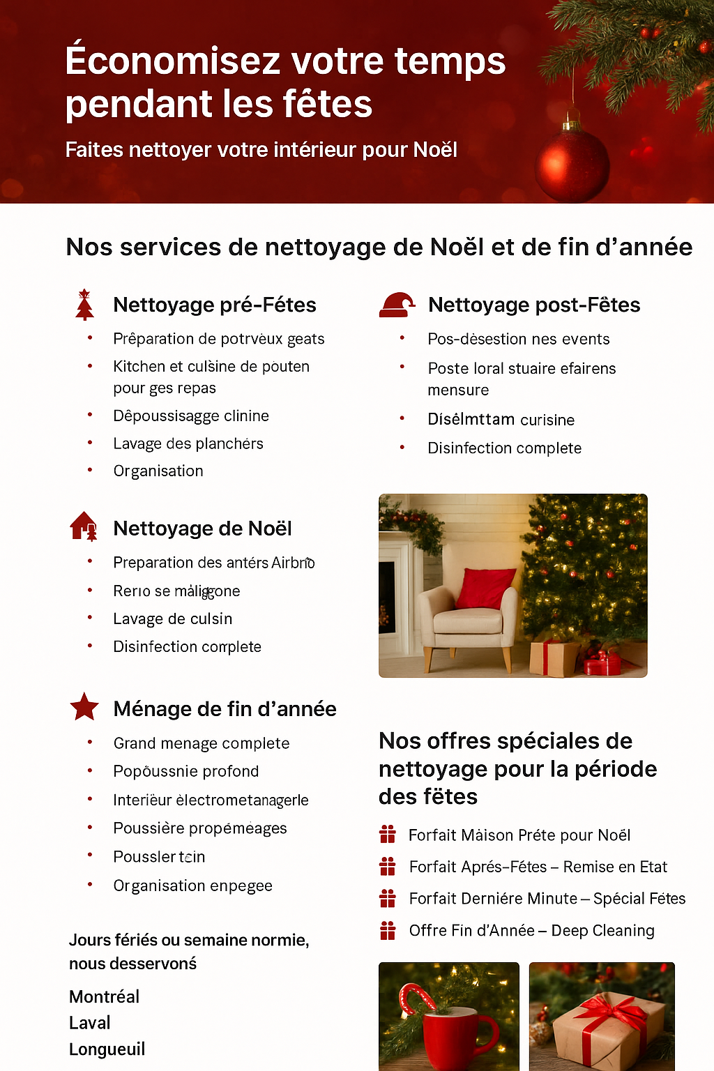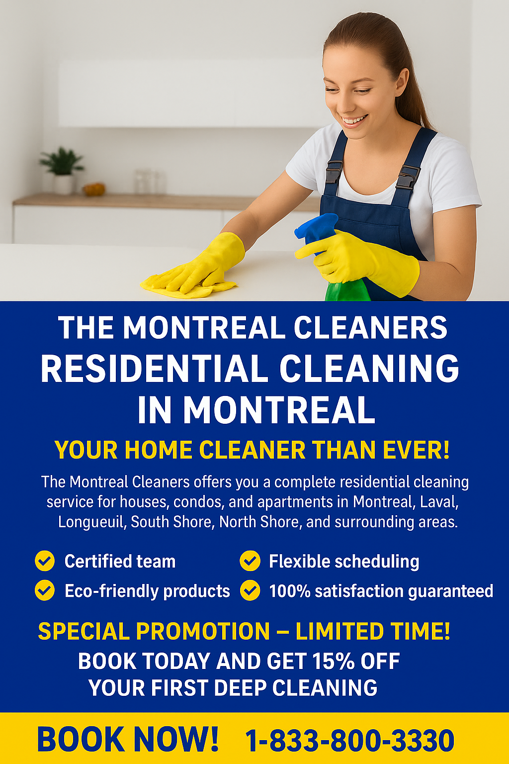 The Montreal Cleaners (Les Nettoyeurs de Montréal) - Services de Nettoyage Professionnel à Montréal Entreprise locale spécialisée dans l'entretien ménager résidentiel et commercial depuis 2010. Nous nous engageons à fournir des services de nettoyage écologiques et personnalisés selon vos besoins. Nos services principaux : • Entretien ménager résidentiel (régulier, profond, après déménagement) • Nettoyage commercial (bureaux, commerces, espaces industriels) • Services spécialisés (nettoyage de vitres, désinfection, nettoyage post-travaux) Pourquoi nous choisir ? ✓ Équipe formée et fiable ✓ Produits écologiques certifiés ✓ Service flexible 7j/7 ✓ Tarifs compétitifs avec devis gratuit